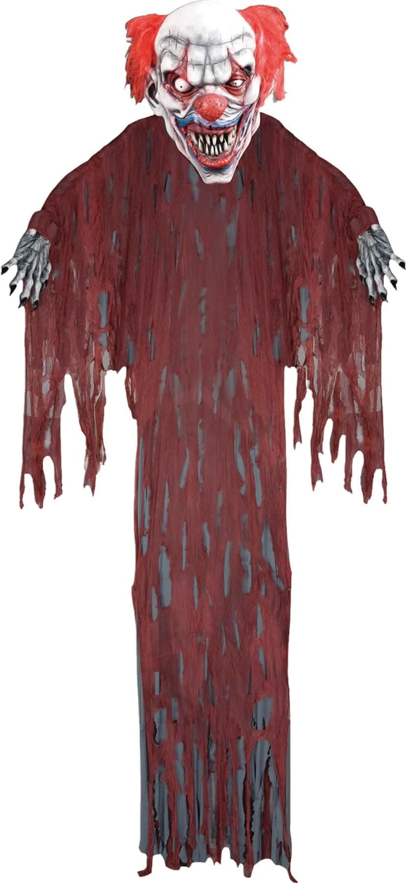 12′ Tall Hanging Evil Clown-ย With a large, deranged clown face that features classic makeup, red nose, and bright orange hair, he’s truly a ghastly sight to behold. Boney skeleton hands stretch out to his sides, while a long tattered red gauze robe makes him look large and menacing.