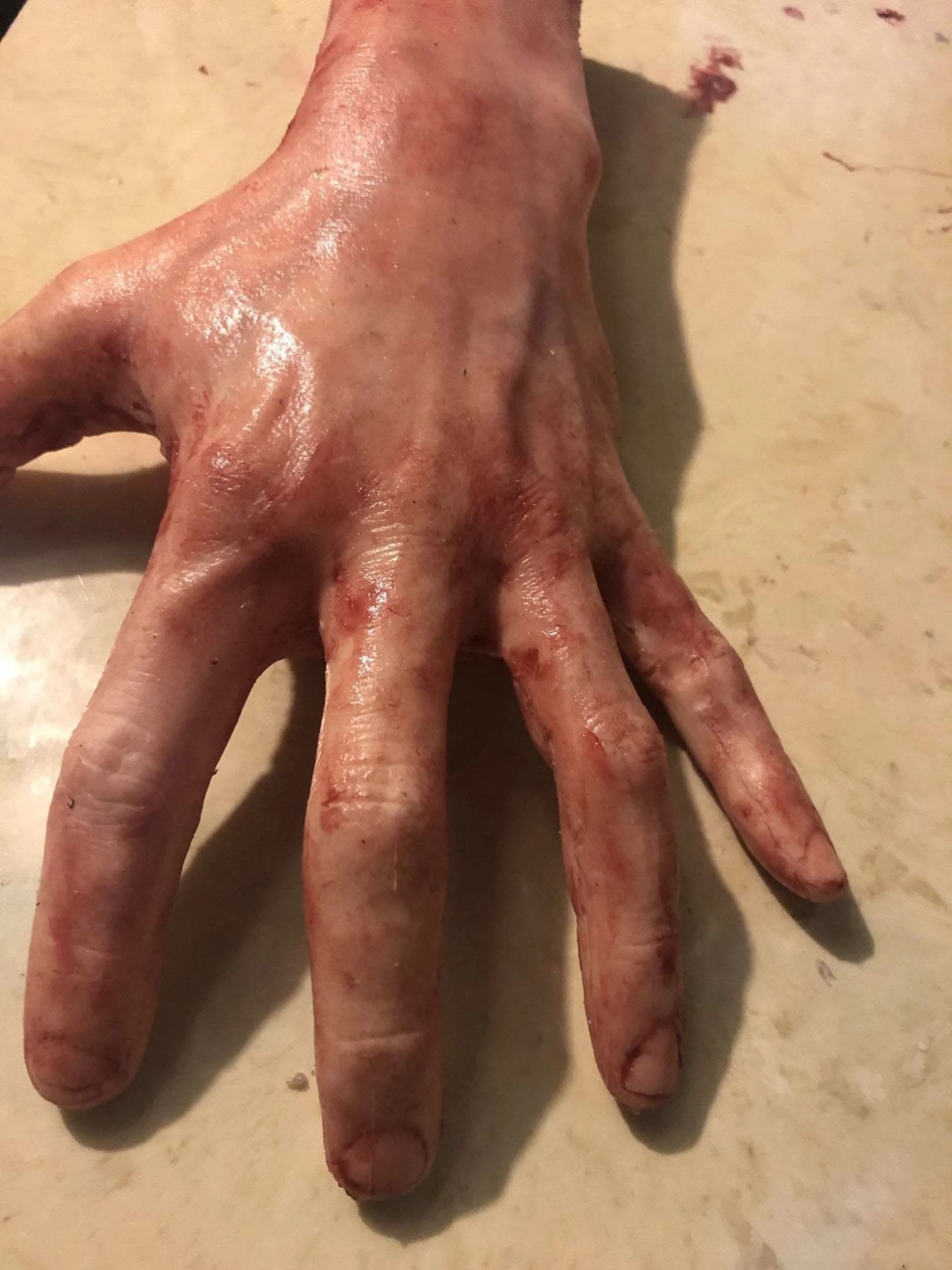 This Severed male hand is skinned in silicone and foam filled. There are minor seam lines as shown In Pics. This is a cheaper version of the solid silicone parts. A perfect addition to your haunt or film set.